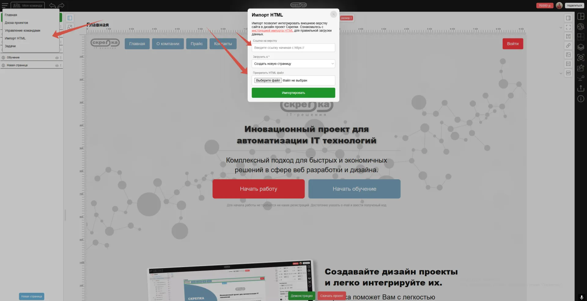 Для импорта HTML, Вам потребуется зайти в проект на СКРЕПКЕ ИТ и выбрать в меню "Импорт", либо напротив Вашей страницы, через троеточие, раздел "Импорт" и у Вас откроется окно с формой импорта