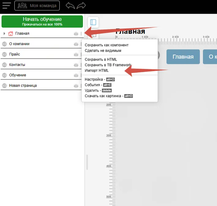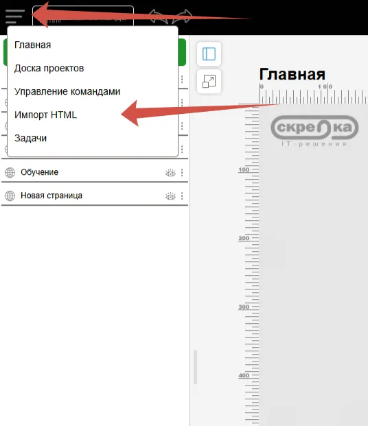 Для импорта HTML, Вам потребуется зайти в проект на СКРЕПКЕ ИТ и выбрать в меню "Импорт", либо напротив Вашей страницы, через троеточие, раздел "Импорт" и у Вас откроется окно с формой импорта